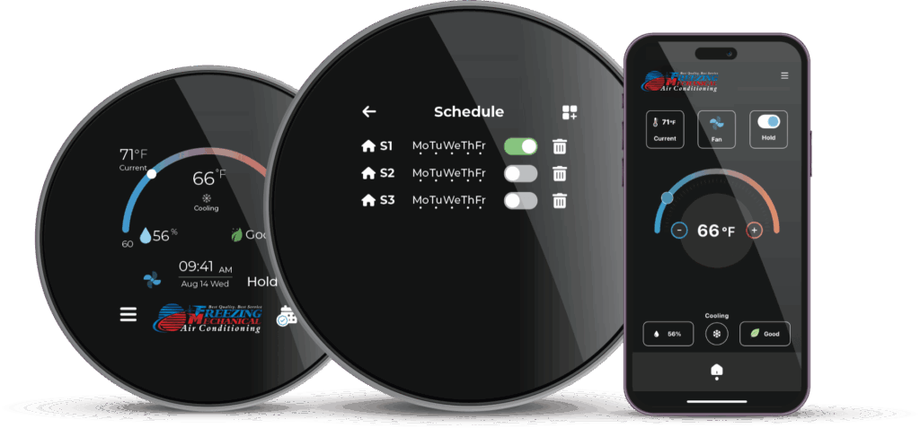When you sign up for our Freezing Mechanical Maintenance Plan, you just pay $99.00 for your new Freeze Smart Thermostat. Level up your home’s comfort with the ultimate smart tool to help you save on heating and cooling bills, control and schedule your home’s climate form anywhere through the Freezing Mechanical App. Additionally, get priority access to maintenance calls directly through your smart thermostat.